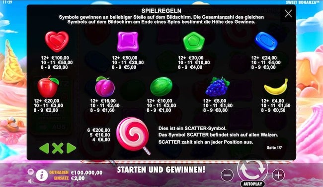 Zehn unterschiedliche Gewinnsymbole warten im Sweet Bonanza Slot auf dich. In allen Fällen handelt es sich hierbei um süße Leckereien wie Bonbons, saftige Früchte oder Lutscher. Unterhalb der Symbole kannst du in der Gewinntabelle genau erkennen, welche Anzahl der Symbole dir welchen Gewinn einbringt. Eine ganz besondere Rolle nimmt der große, rot-weiße Lutscher ein. Hierbei handelt es sich um einen Scatter, der auf allen Positionen Gewinne auszahlt. Sollten mindestens vier Scatter auftauchen, aktivierst du die Freispiele mit zunächst zehn Freespins. Innerhalb der Freispiele erhältst du durch weitere drei Scatter aber fünf zusätzliche Freegames. Innerhalb der Freegame-Runden solltest du vor allem auf das Multiplikator-Symbol hoffen. Sobald dieses auftaucht, nimmt es einen Multiplikatorwert zwischen 2 und 100 ein. Besonderheit: Dieses Feature bleibt im Falle eines Gewinns bis zum Ende des Tumble-Features.